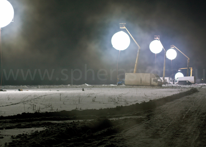 Световые сферы можно устанавливать на различных видах спецтехники, а также наполнять гелием и укреплять на тросе, что позволить осветить всю строительную площадку. В качестве источника питания можно использовать не только электросеть, но и генератор, а также аккумуляторы, которые рассчитаны на 2 часа бесперебойной работы световой сферы.