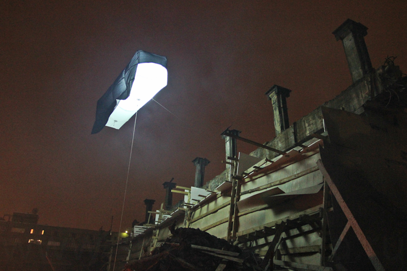 20. Создан специально для замкнутых декораций. Наполняется гелием и летает, или надувается воздухом и подвешивается. В данном случае гелиокуб еще и гибридный. На борту установлена одна галогеновая лампа 5 кВт + одна металлогалогеновая 575 Вт.