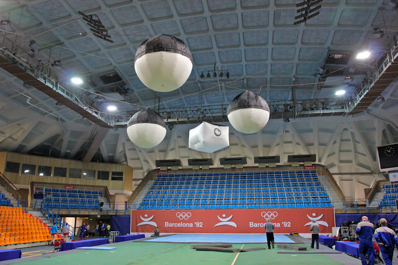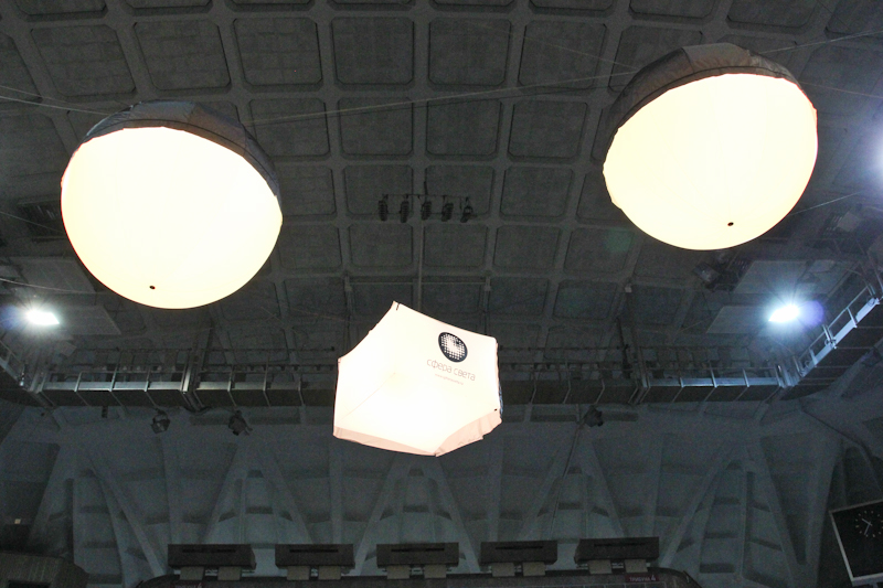 Сферы были подвешены над площадкой с растяжкой за технологические балконы под потолком спорткомплекса.