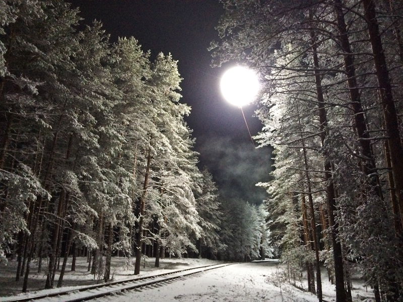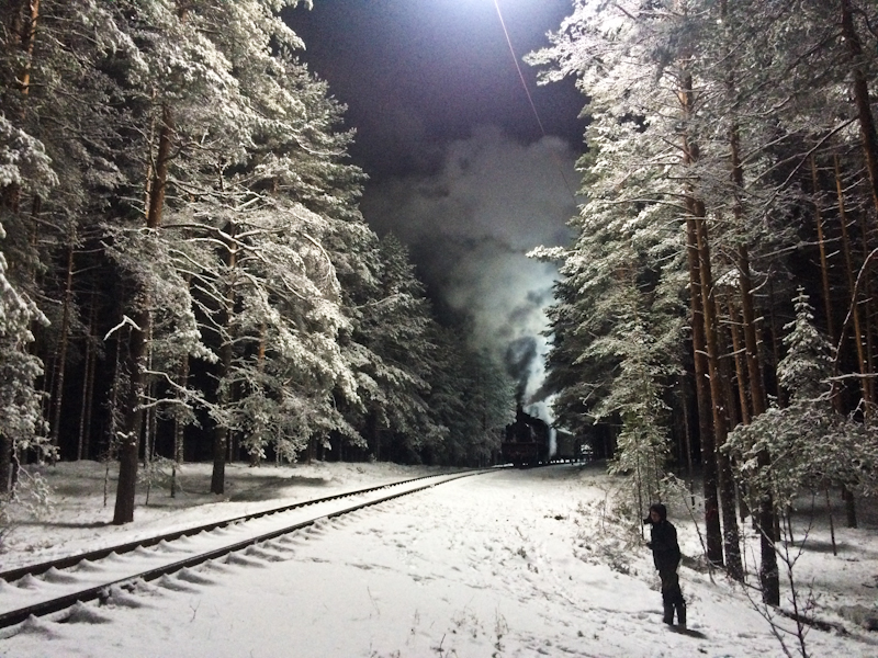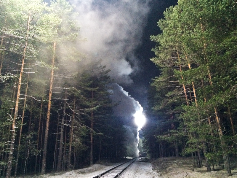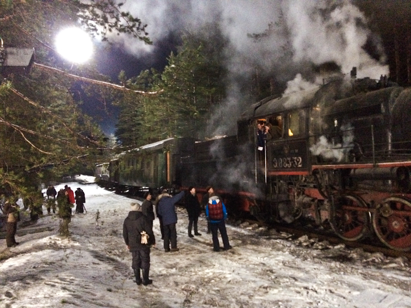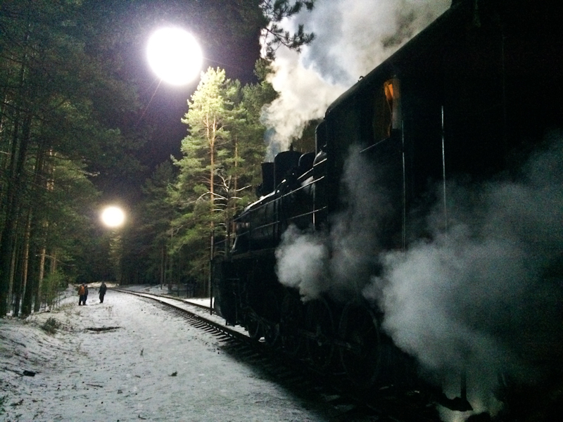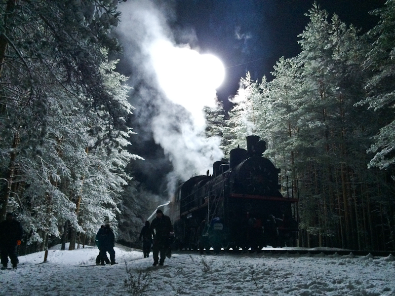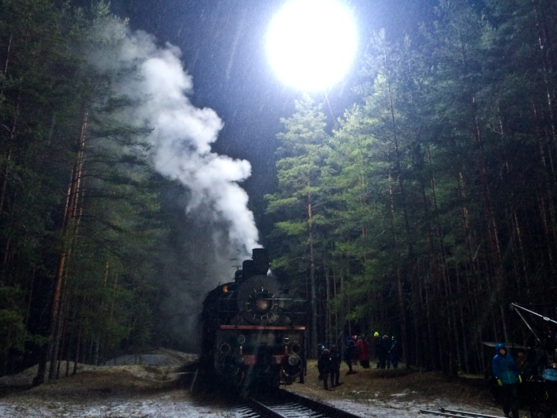 На базе железнодорожных войск на одноколейном полотне дороги в главной роли снимался настоящий паровоз. Дорога проходила через лесной массив, по обе стороны насыпи росли ели по 25 - 30 метров. Для освещения площадки оператор выбрал три гелиевых шара мощностью по 16 кВт.