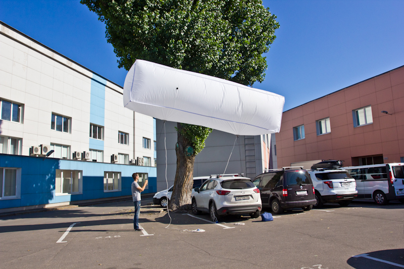 Изначально предполагалось наполнить гелиотрубу воздухом и подвесить к перекрытиям павильона - это было вполне возможно. Но в конечном итоге съёмочная группа предпочла использовать гелий и иметь летающий прибор, который можно оперативно переустановить при смене кадра и сцены. Время необходимое для перестановки летающей гелиотрубы не превышает 5 минут, в то время как передвинуть подвешенную к потолку трубу можно не быстрее чем за 25-30 минут.