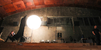 | Штативные световые шары подсвечивают интерьер в мебельном торговом центре при съёмках рекламного ролика |