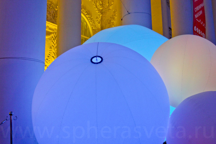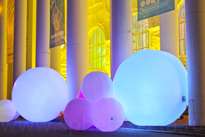 Огромная инсталляция из двух молекулярных гелио и сенсорных сфер, диаметром 1,5—2—3,5 метра, переливалась всеми цветами видимого спектра, подсвечивая колоннаду главного входа.